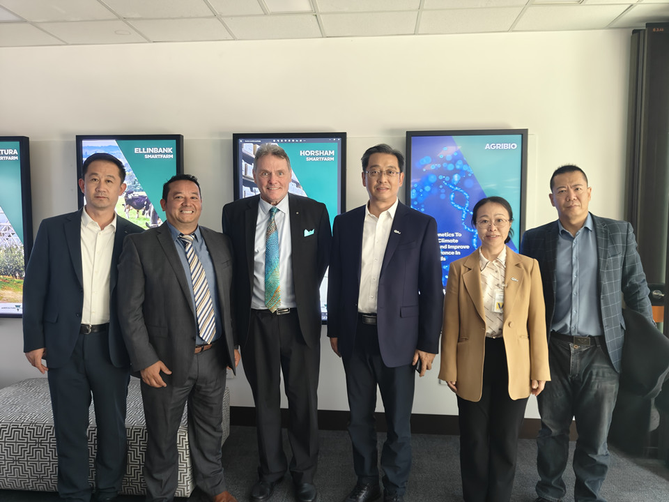 在澳大利亚维多利亚州农业研究中心,代表团与中心主任西蒙娜·沃纳教授进行座谈,重点了解了该中心“以研究中心为核心、辐射智慧农场建设与应用”的工作机制,并从生物安全、环境变化、生产力及可持续发展等方面了解了中心科研领域和取得成绩,重点了解其与高校、企业的合作模式及科研成果转化路径及成果。潘军表示,中心建设经验值得学习,希望双方进一步深入合作,在科技研发及国际产学研用合作不断开辟新路径。双方签署共建草业创新联盟,并为该联盟成立揭牌。代表团一行还前往计算生物学实验室、分子基因学及表型学实验室,计算生物学试验、虚拟农场、数据基因公司等地调研。